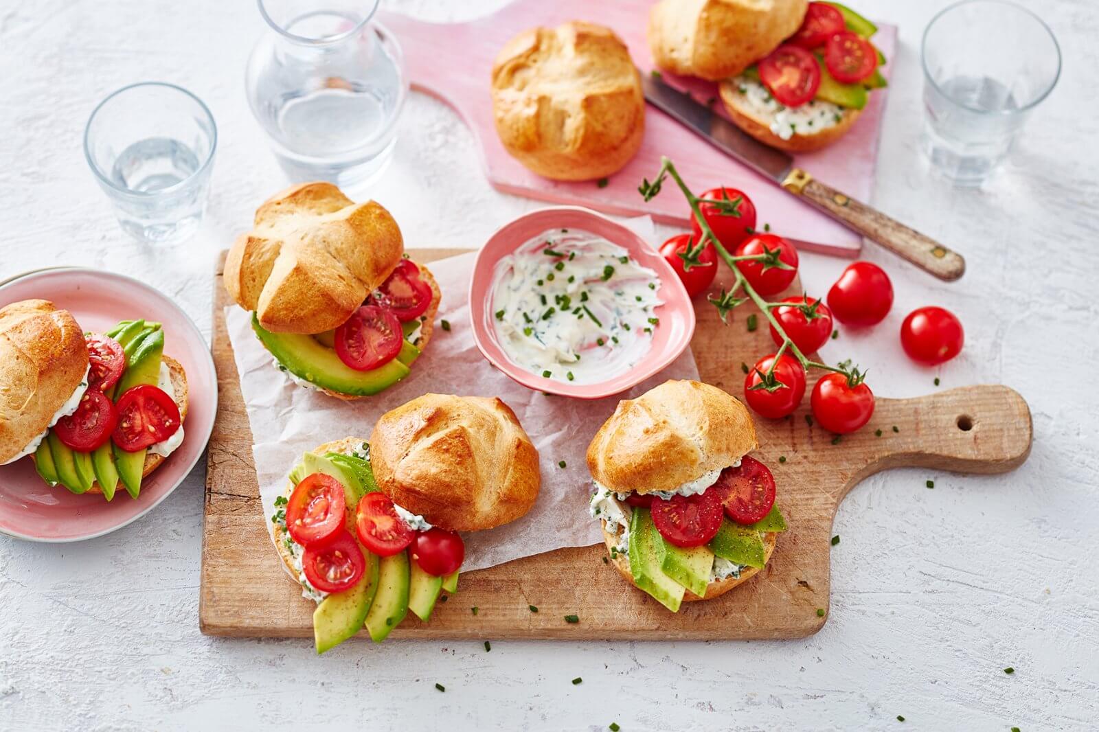 - Als de broodjes uit de oven komen, snijd je deze open en beleg je deze met de roomkaas, avocado en tomaat. Eet smakelijk!