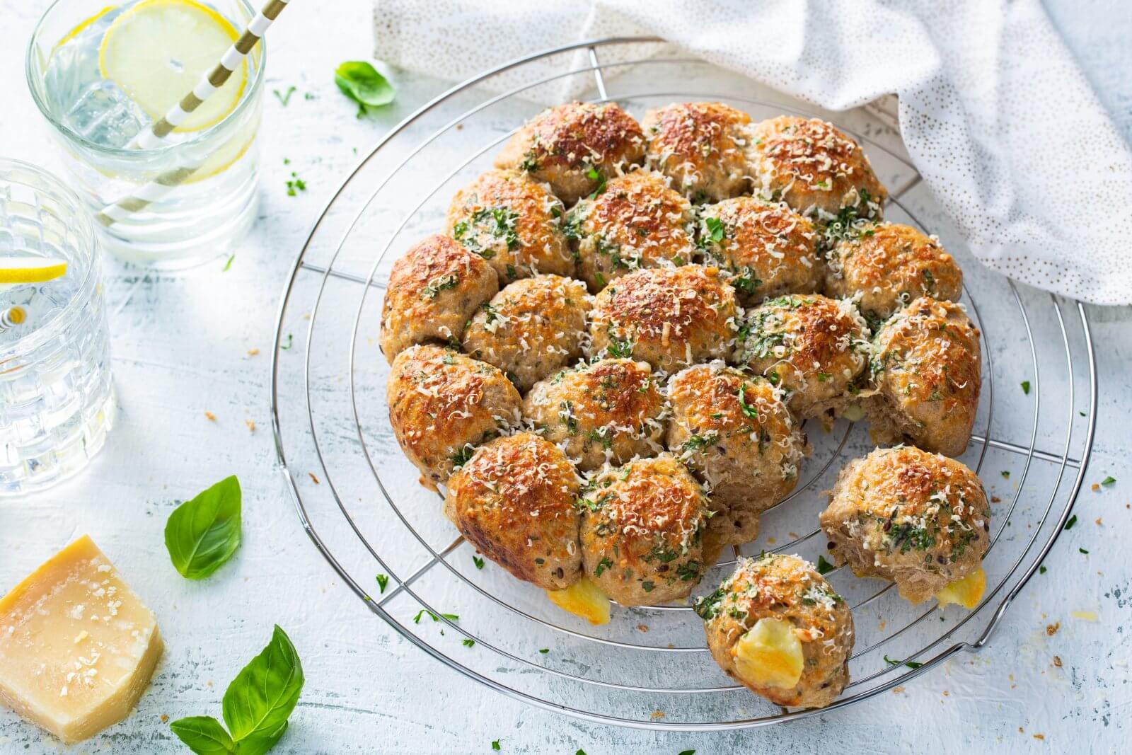 4. Druk de bolletjes deeg een beetje plat en leg in het midden wat geraspte kaas. Vouw het deeg om de kaas zodat het deeg rondom is afgesloten. Herhaal deze stap tot alle deegbolletjes gevuld zijn. Leg de bolletjes speels op een met bakpapier beklede springvorm.