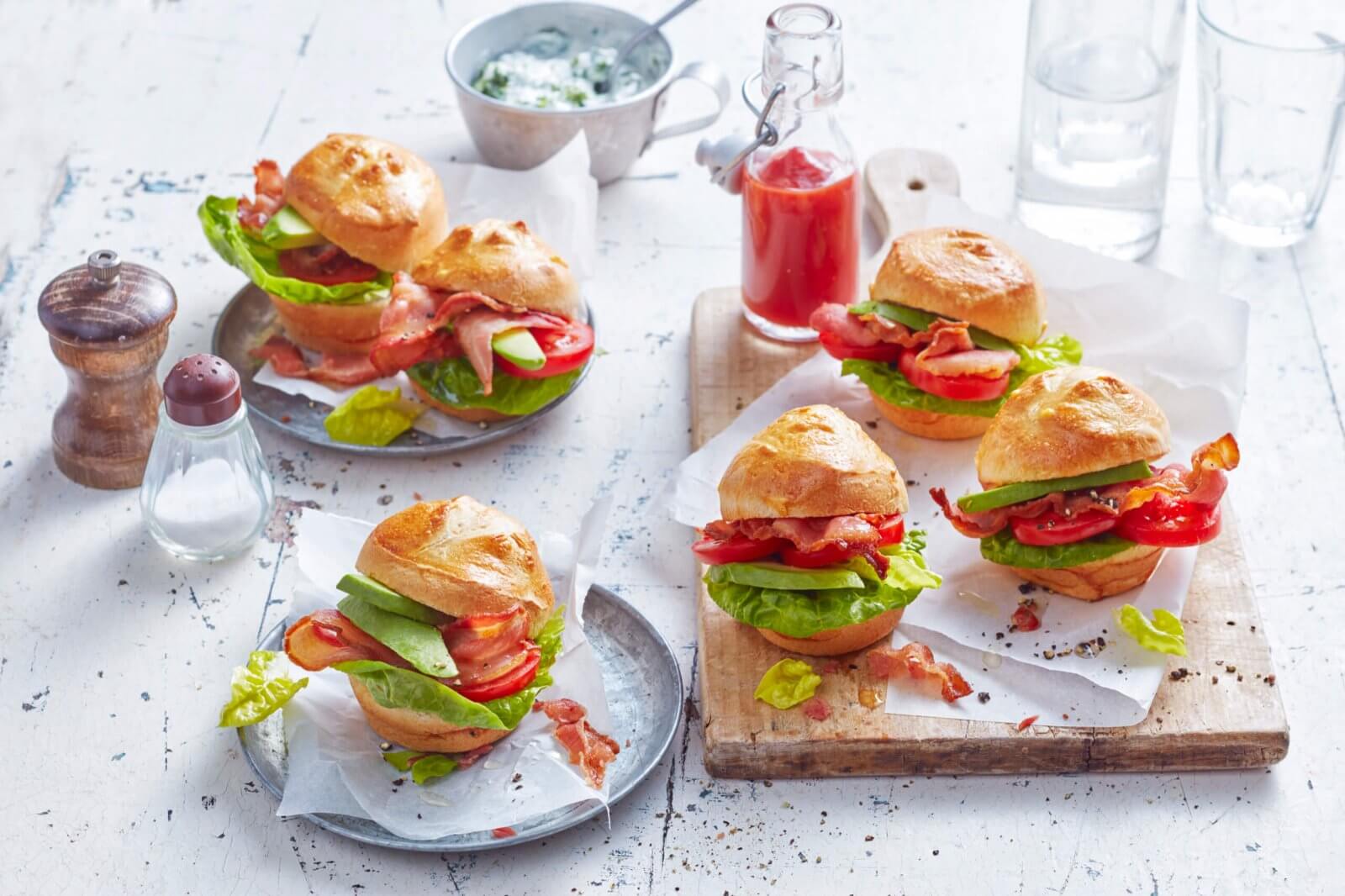 - Snijd de broodjes open en beleg ze met eerst een blaadje sla, vervolgens tomaat, bacon en tot slot avocado.