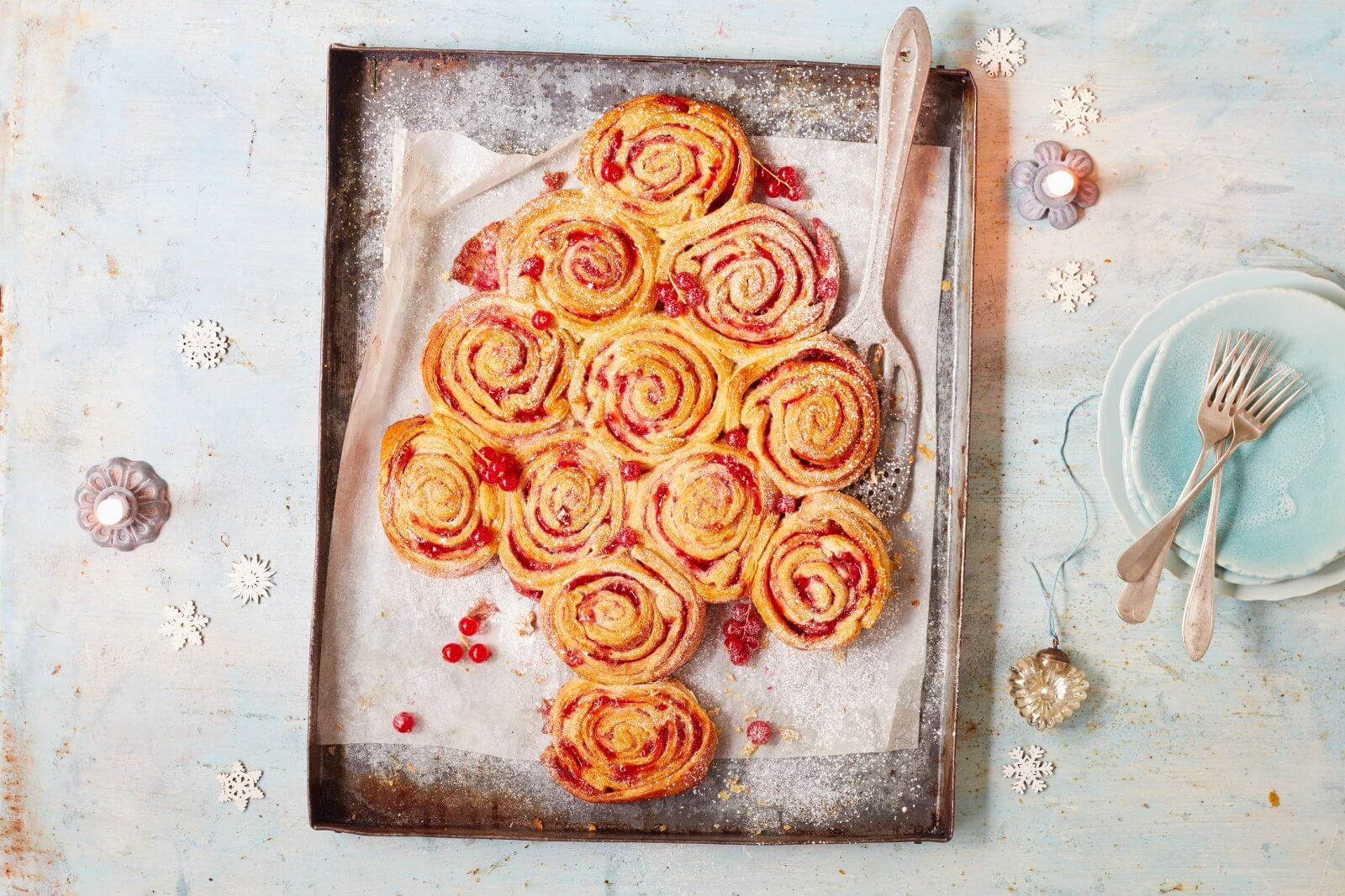 Een fruitboom, maar dan in kerststijl! En wat is er nu feestelijker dan deze jam-rolletjes op tafel tijdens de kerstbrunch? Groot genoeg om gezellig op te smikkelen met de hele familie.