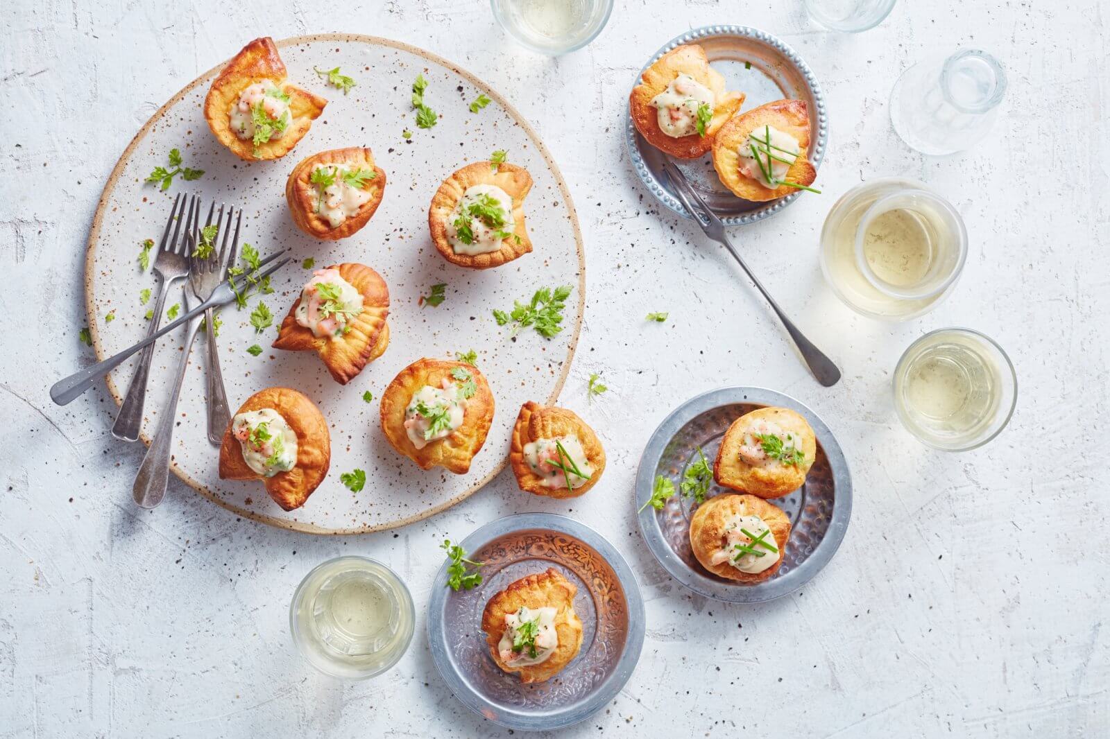 Snel, licht, luchtig… Deze knapperige deegkuipjes zijn al feestelijk van zichzelf. Royaal gevuld met garnalenragout zet je met deze hartige party mini’s de perfecte amuse op tafel. Kleine hapjes, een groot gebaar!