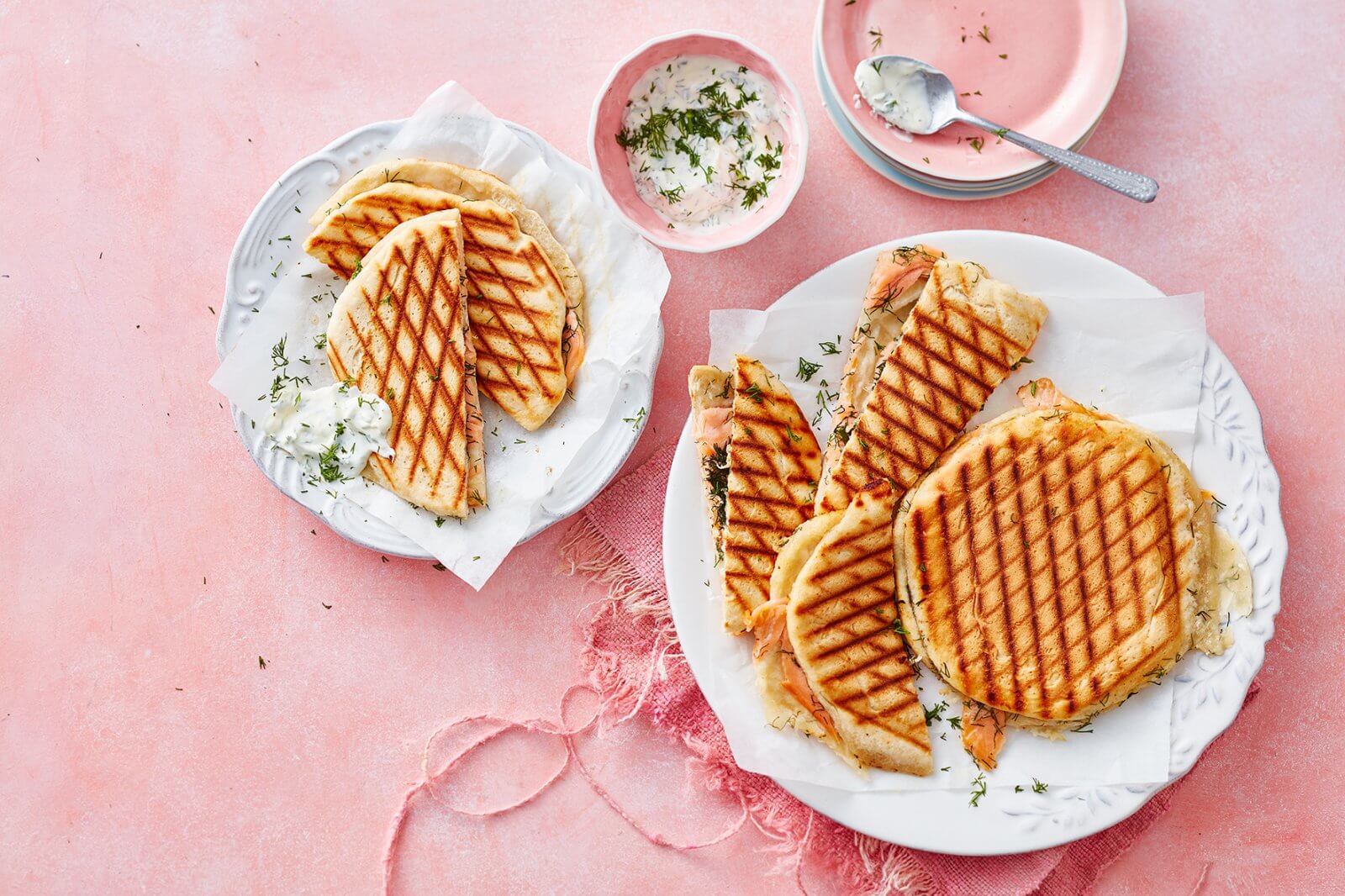 - Besmeer drie lappen deeg met creme fraiche, en beleg met de gerookte zalm en fijngehakte dille. Leg de andere drie lappen deeg hier op.